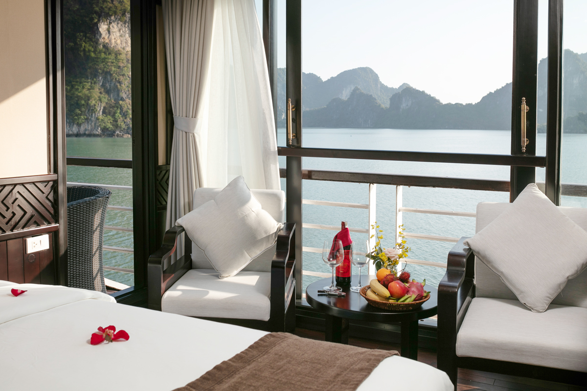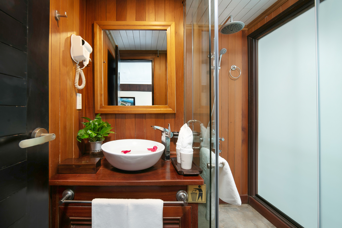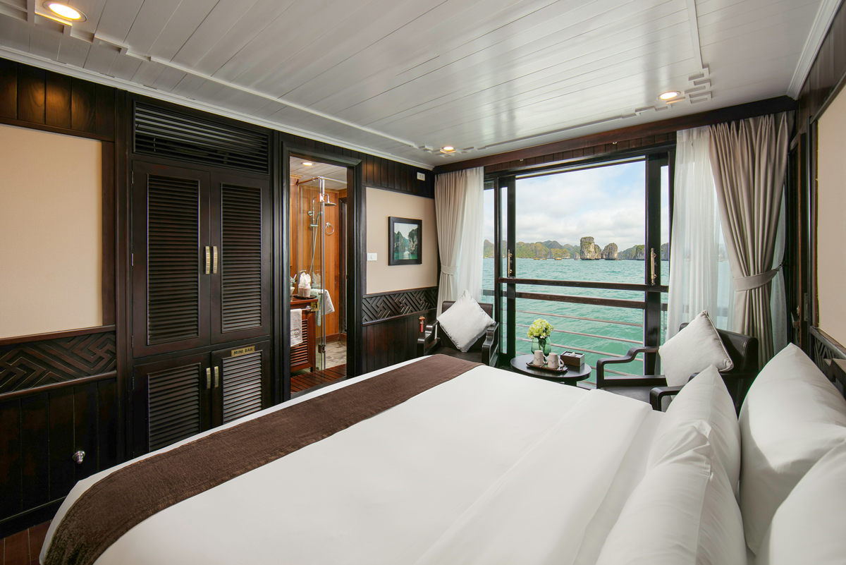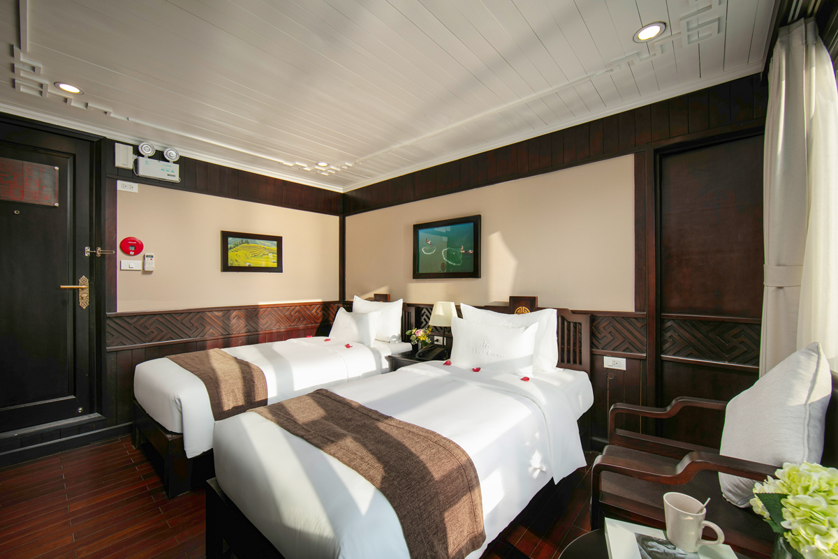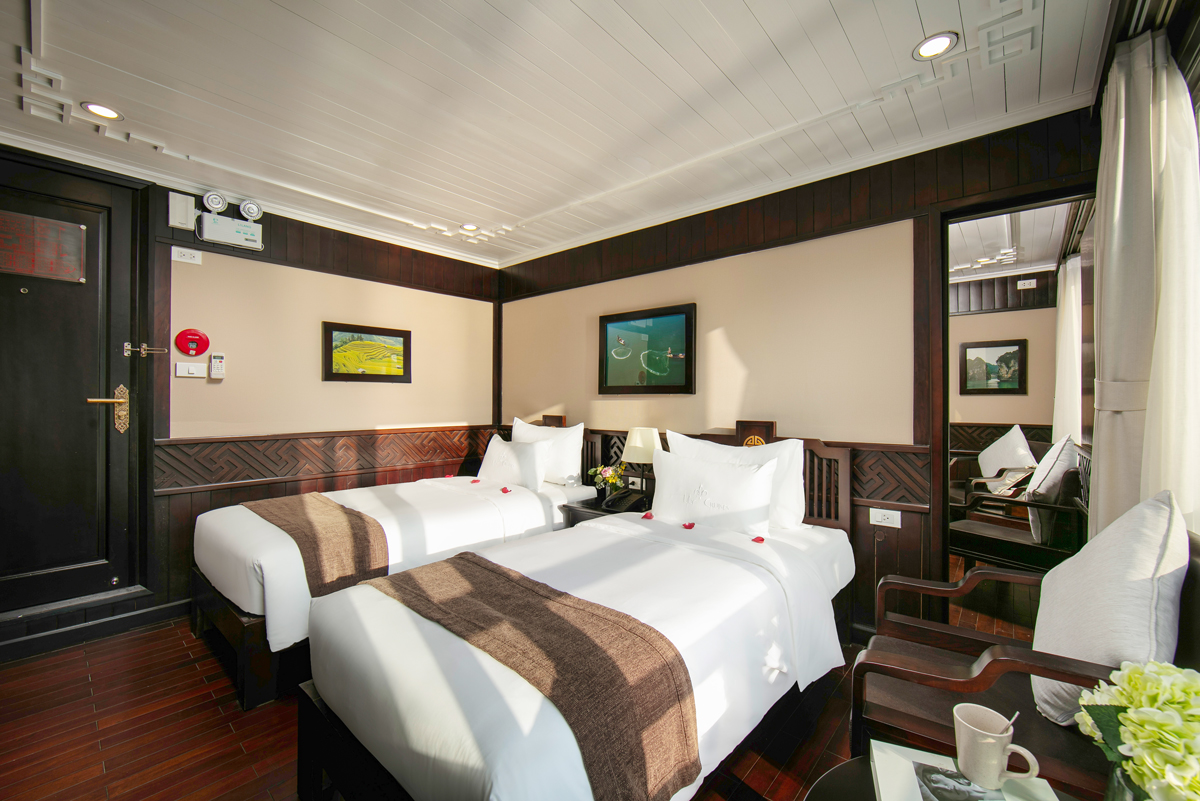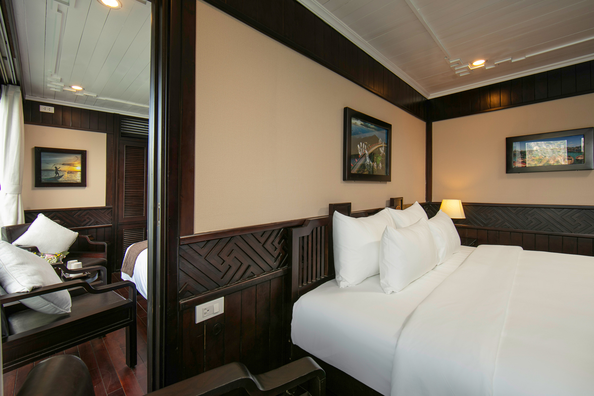Family Deluxe Cabins are located on the first floor where rooms combine flexibility of 01 Double Deluxe Cabin and 01 Twin Deluxe Cabin. This room has the connecting door which is the most convenience for family group. You absolutely are impressed the luxurious facilities and the modern convenience amenities of cabins. Also passengers are supplied the excellent cabins with charm, cleanliness, luxury. The plus point of cabins are handmade wooden decoration which curved by the skillful and professional Vietnamese artisans.